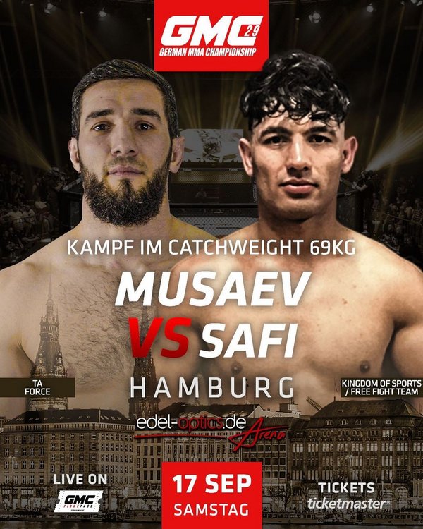 Dafür bekommt er die Chance gegen Amir Safi (0-4), der bislang zweimal bei GMC kämpfte sowie zweimal bei Hype FC. Auf einen Sieg wartet der der 20-Jährige noch, stand jedoch auch mit starken Athleten wie Khurshed Kakhorov oder Felix Schiffarth im Käfig. Jetzt will Safi, der nach zwei Jahren Auszeit wieder neu angreift, für eine Überraschung sorgen und als krasser Außenseiter nicht nur Musaevs Kinn testen, sondern diesen auch bezwingen.