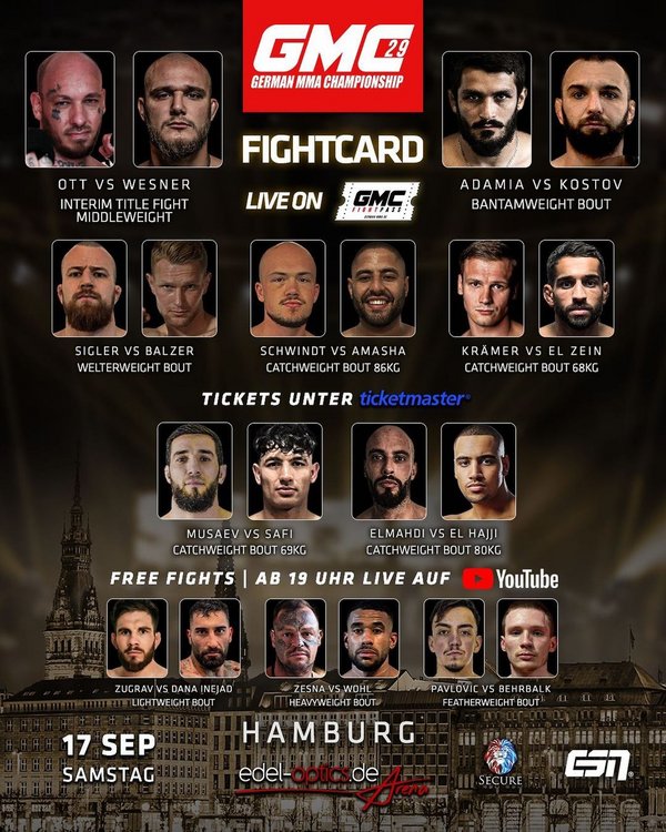 Die öffentliche Waage findet am 16. September um 18:00 Uhr im Arcadia in Hamburg statt. GMC 29 startet dann einen Tag darauf in der Edel-Optics Arena. Tickets gibt es unter folgendem Link.