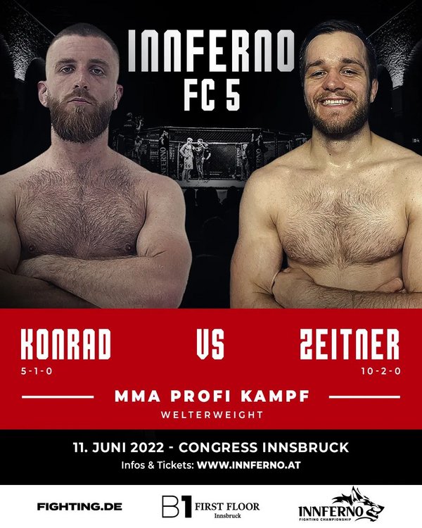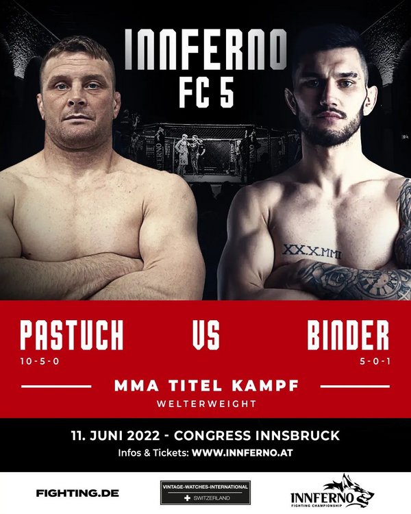 Die 5. Ausgabe von Innferno Fighting Championship ist startklar. Am 11. Juni stehen im österreichischen Innsbruck elf Duelle auf dem Programm, allen voran zwei Begegnungen um Edelmetall. So wird es Andreeas Binder im Kampf um die Krone im Weltergewicht mit dem erfahrenen Roberto Pastuch zu tun bekommen, während Florian Aberger und Erikas Golubovskis um die Vorherrschaft im Mittelgewicht kämpfen. Mit dabei sind auch Action-Garanten wie Bogdan Grad oder Adrian Zeitner. Wir blicken für euch auf das anstehende Kampfprogramm.