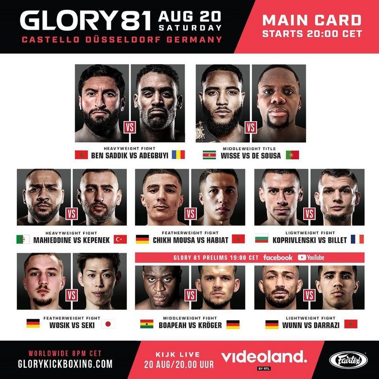 Am 20. August kehrt Glory mit der 81. Ausgabe nach Deutschland zurück. Im Main Event stehen die schweren Jungs. Im Heavyweight kommt es zum Top-5-Duell zwischen Jamal Ben Saddik und Benjamin Adegbuyi, die im Düsseldorfer Castello die Fäuste schwingen werden. Des Weiteren werden einige der besten deutschen Kämpfer an den Start gehen.