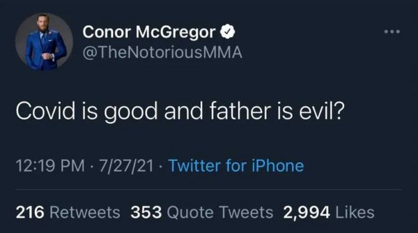 Denn Montagnacht erschien ein Tweet McGregors, in dem er darauf Bezug nahm und schrieb „Covid ist gut und Vater ist böse?“