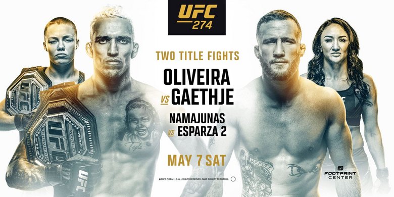 Die UFC hat für die Nacht zum 8. Mai einen Mega-Event in Arizona angesetzt, in dem zwei Titel auf dem Spiel stehen. Im Main Event von UFC 274 verteidigt Leichtgewichts-Champion Charles Oliveira seinen Gürtel gegen den ehemaligen Interims-Champion Justin Gaethje. Im Co-Hauptkampf kommt es zum Revanche-Duell zwischen Strohgewichts-Titelträgerin Rose Namajunas und Carla Esparza. Des Weiteren kollidieren Michael Chandler und Tony Ferguson, Mauricio “Shogun“ Rua ist zurück und auch Donald Cerrone steigt wieder ins Octagon.